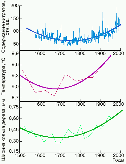 | Рис. 4. Сравнительный анализ временного хода концентрации нитратов в полярном льду и вариации температуры по различным индикаторам: температура центральной Англии, ширина годичных колец сосны в Калифорнии |