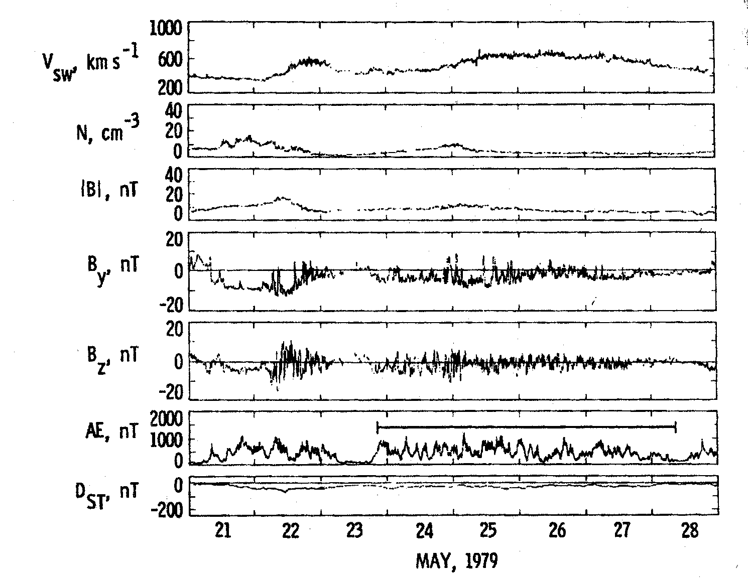 Характерным для ВСП является существование в теле потока длительных цугов альвеновских волн, распространяющихся от Солнца (High Intensity Long Duration Continuous AE Activity, HDLDCAA). Период этих альвеновских нюлн у орбиты Земли может составлять в среднем Т=З+8 часов. Эти волны ответственны за появление -Bz компоненты у орбиты Земли. Типичный пример распределения параметров .в теле ВСП показан на рис.2 [Tsurutani,Gonzalez, 1987].