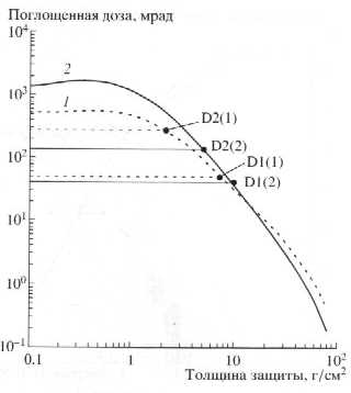 Рис. 6. Расчетные зависимости среднесуточной по-глощенной дозы на орбитах ОС Мир (кривая /) и МКС (кривая 2) в зависимости от эффективной тол-щины плоской защиты и экспериментальные данные дозиметров Р-16 (точки) для СПС в ноябре 2000 г. Точки D (1) и D2 (1) - показания дозиметров № 1 и № 2 на ОС Мир, соответственно. Точки D1 (2) и D2 (2) - показания дозиметров № 1 и № 2 на МКС, соответственно.