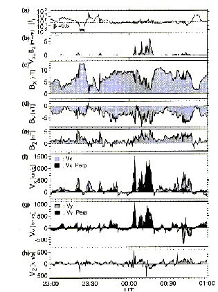 На рисунках 1 и 2 даютcя примеры наблюдений на спутнике Geotail. Сверху вниз: