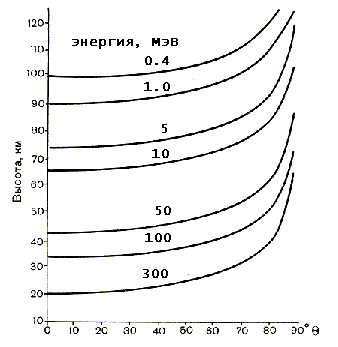 | Рис 3. Глубина проникновения протонов с энергией 0.4 - 300 МэВ в зависимости от угла наклона траектории. | Рис.4 Профили электронной плотности, измеренные с помощью ракет в спокойное время (1.2) и во время ППШ (3-5) |