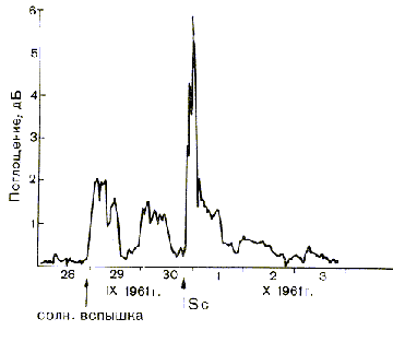Резкий рост поглощения после начала магнитной бури связан с тем, что к ППШ добавляется авроральное поглощение, вызванное сбросом в атмосферу свежеускоренных электронов с энергией от единиц и до сотен кэВ.